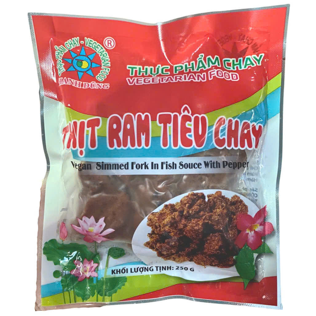 Thịt Ram Tiêu Chay Thanh Dũng đã được chuẩn bị sẵn dạng miếng vừa ăn, với độ dai và sớ thịt giống như thịt thật. Chỉ cần hâm nóng lại và dùng, bạn có thể tận hưởng một bữa ăn chay ngon miệng mà không cần phải mất nhiều thời gian vào việc chuẩn bị.